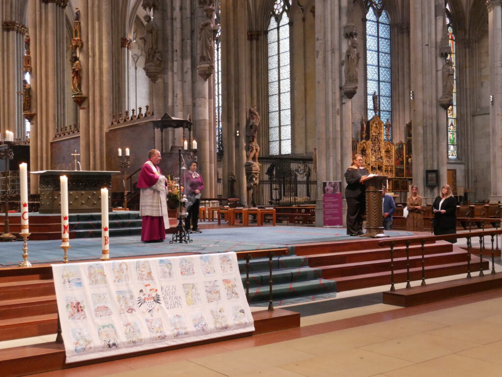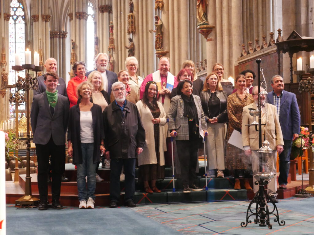 In diesem Jahr konnten wir eine sprachliche Premiere erleben: Das Gebet wurde auch auf Kölsch vorgetragen. Der Städtepartnerschaftschor „Klangbrücke“ unter Leitung von I. Dürr trat, mit Unterstützung eines weiteren Chores, erstmals beim Friedensgebet auf. Er begann mit dem Lied „Unser Stammbaum“ von den „Bläck Fööss“, später: ein Lied aus Barcelona, auf Türkisch „Üsküdar `a giderken“ und Fr. Dürr sang als Solistin das og. Friedenslied.